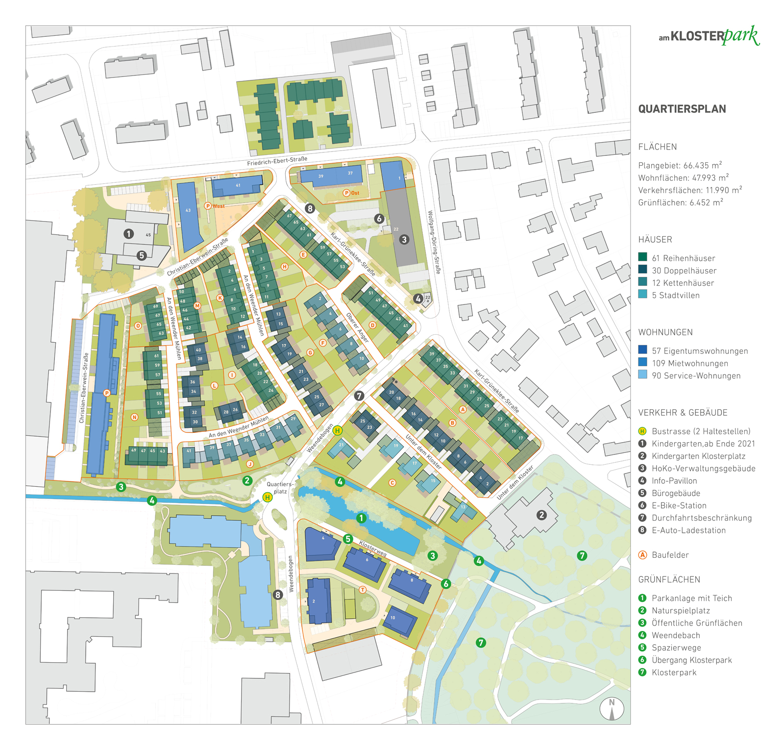 Die Reihen-, Doppel- und Kettenhäuser werden in kleinen Gruppen mit privaten Gärten angesiedelt und über öffentliche Zufahrtswege erschlossen. Der Mietwohnungsbau wird nördlich des Plangebietes angrenzend an die Friedrich-Ebert-Straße errichtet. In der Toplage neben dem Park und der Teichanlage werden 5 individuelle Stadtvillen und südlich die 57 Eigentumswohnungen in 5 Gebäuden erstellt. Das Eckgebäude im südwestlichen Teil des Gebiets ist für das Projekt „Service-Wohnen“ reserviert. Das Plangebiet verfügt über Anknüpfungspunkte an die nördlich und östlich umliegenden Wohngebiete, den öffentlichen Klosterpark im Südosten sowie an das Gewerbegebiet Lutteranger im Süden.